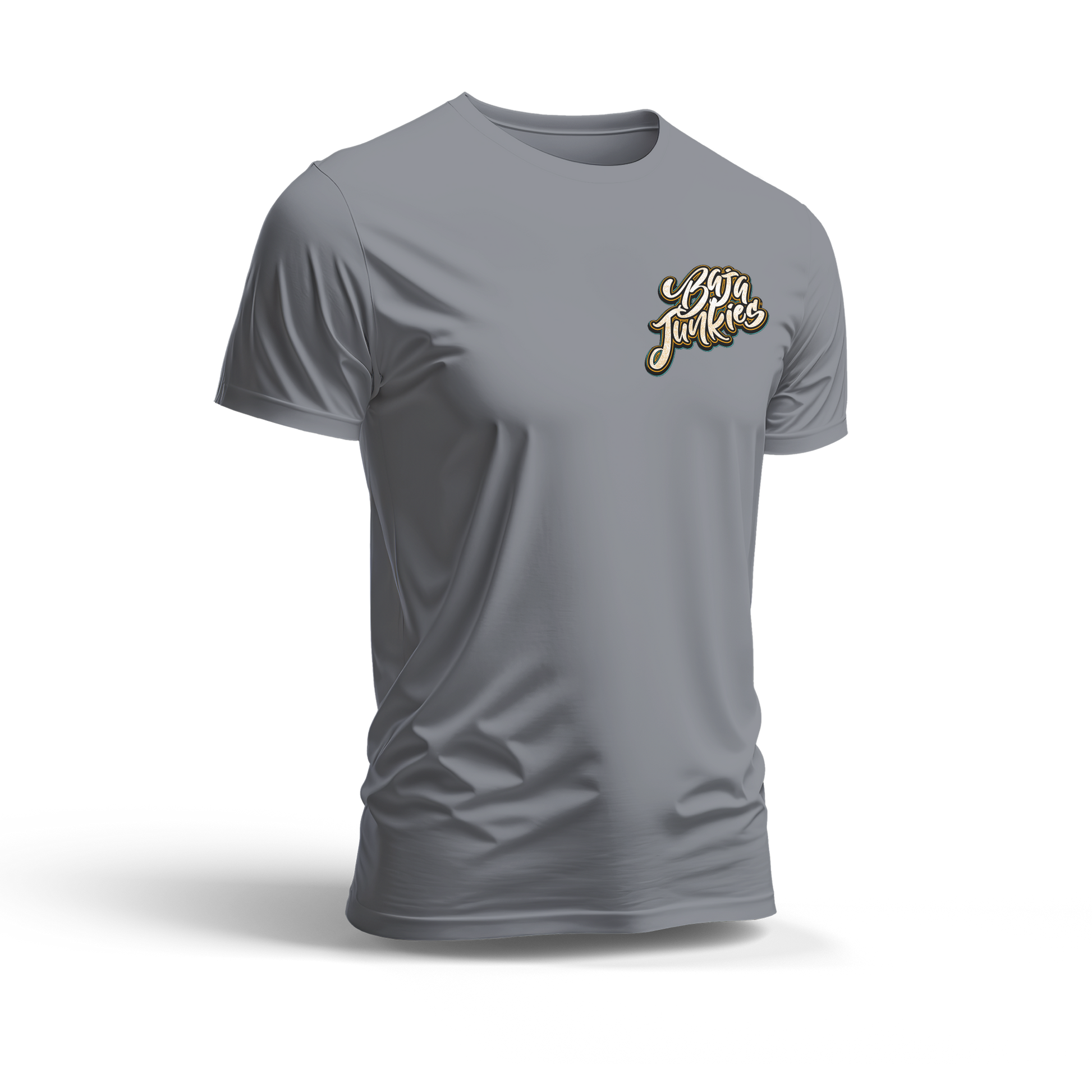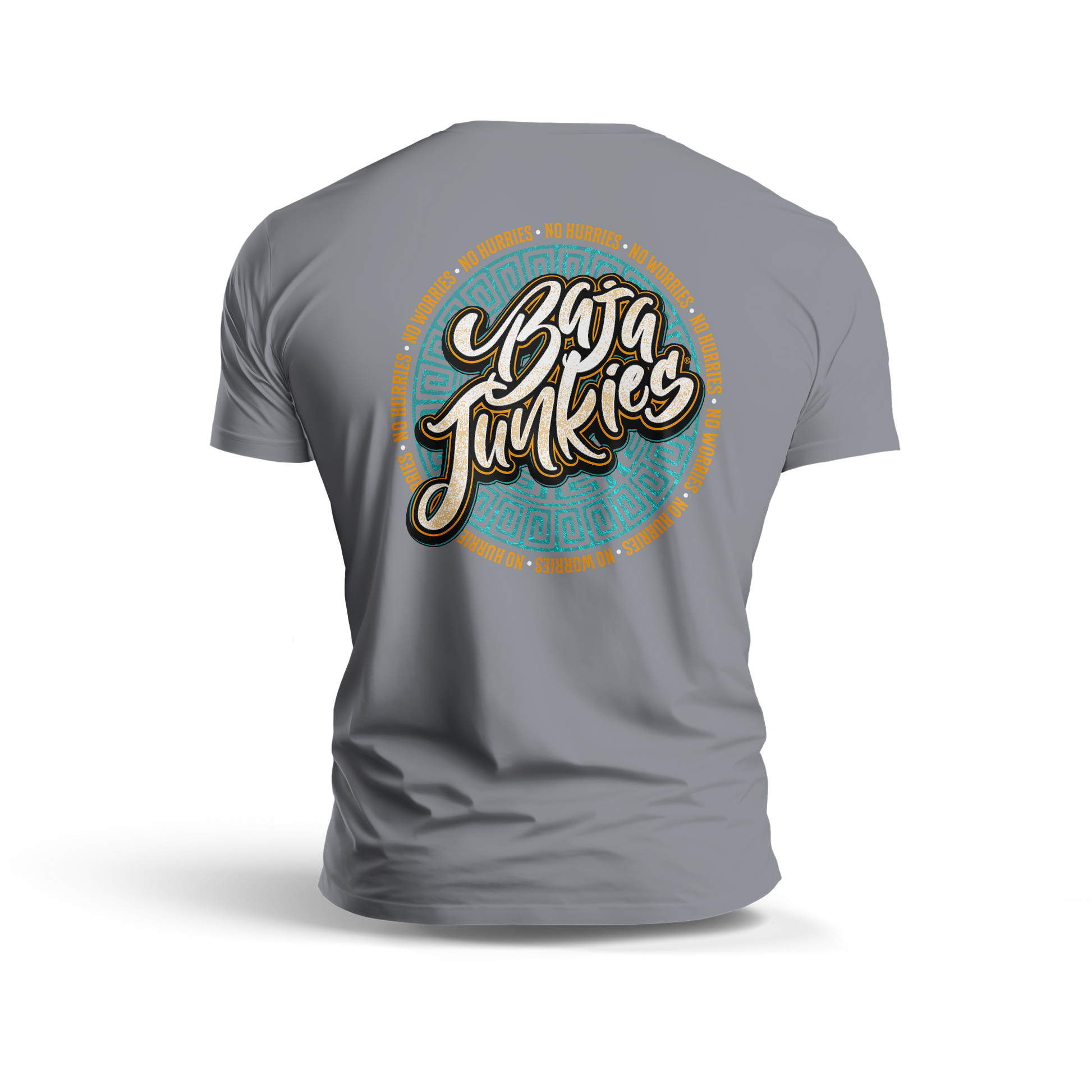 From the Baja Junkies Lifestyle collection. The "Aztec" Tee is a 100% Cotton Charcoal Color T-shirt with a 5 Color design front left chest, and 5 color design on the back. Screen-printed by our sister company Ntensetees.com