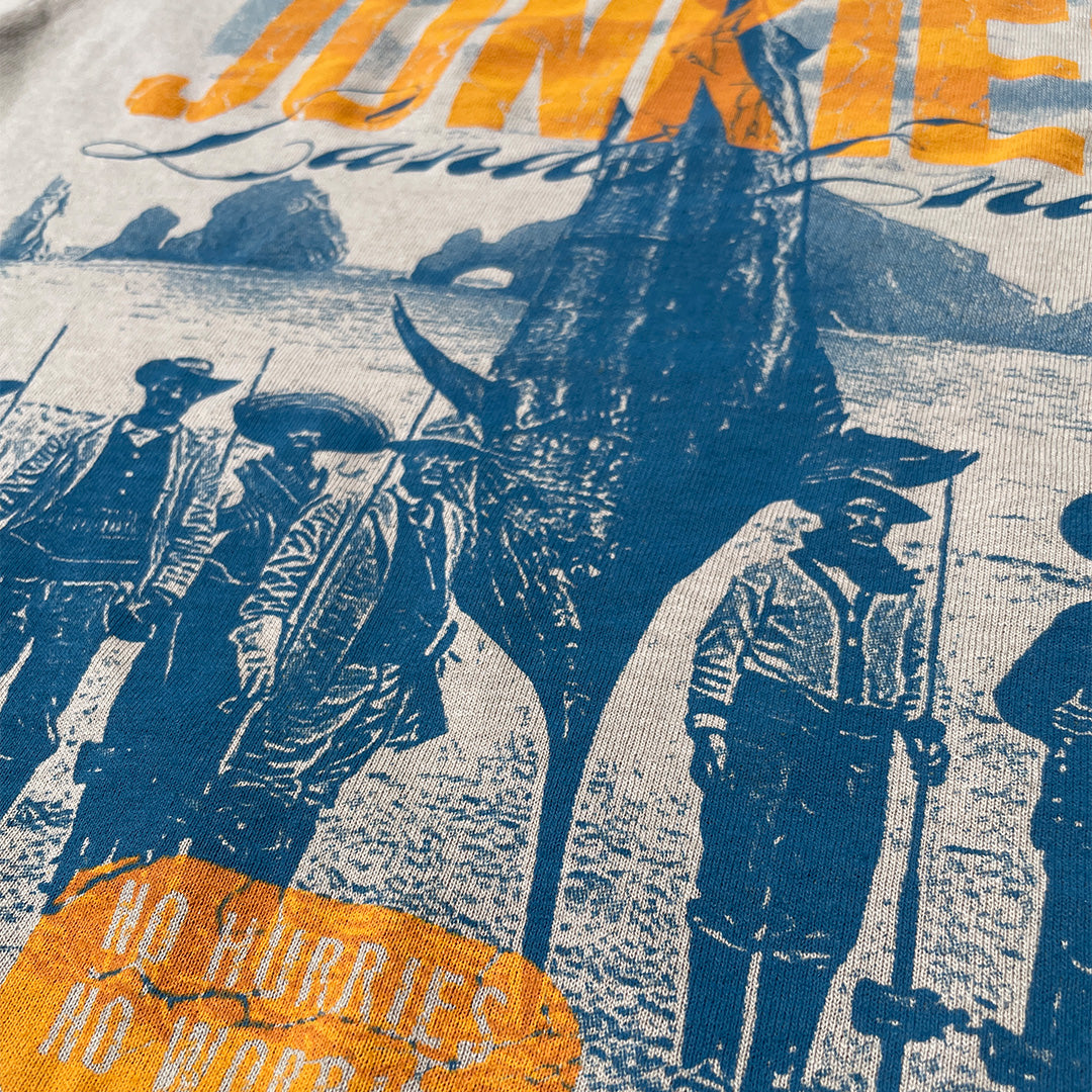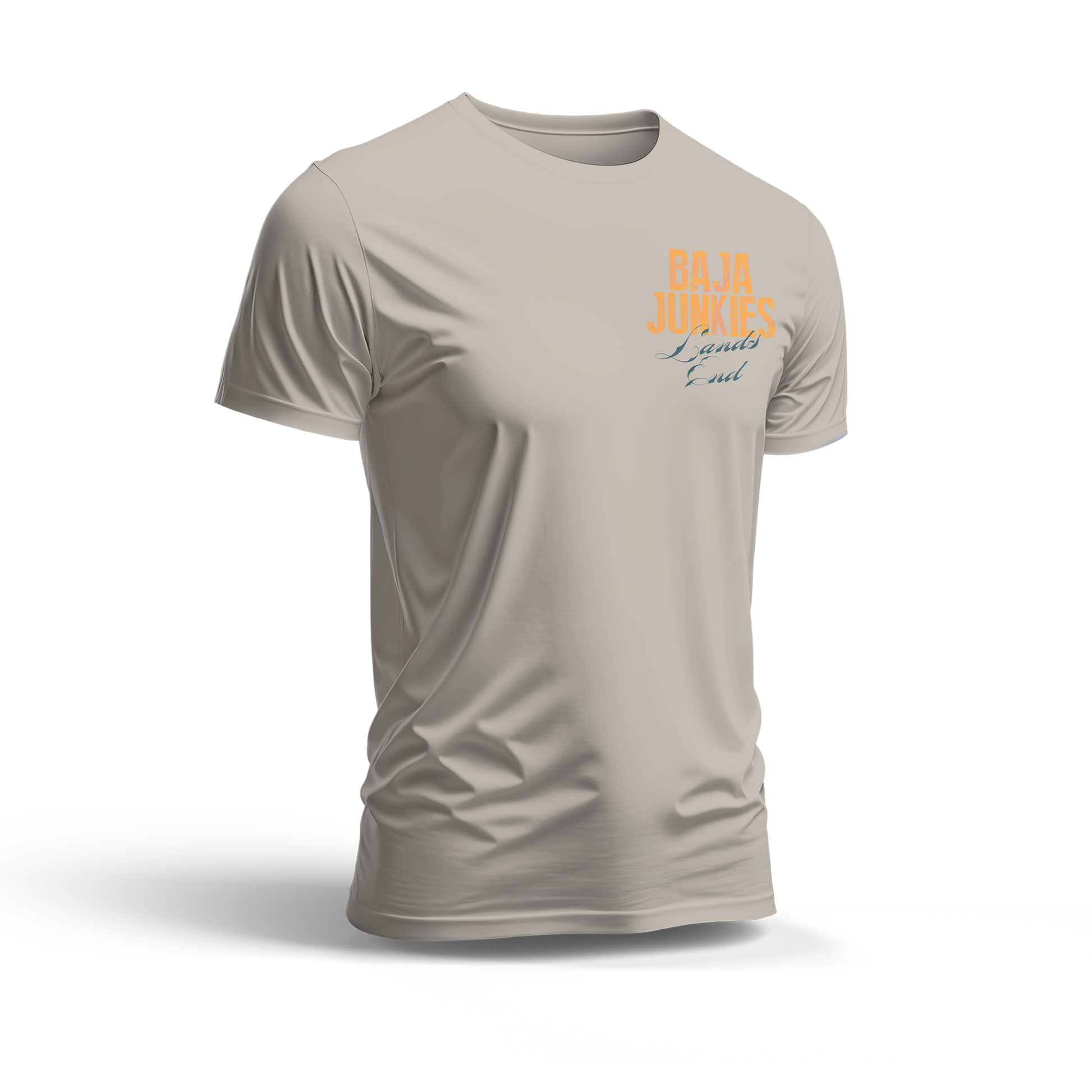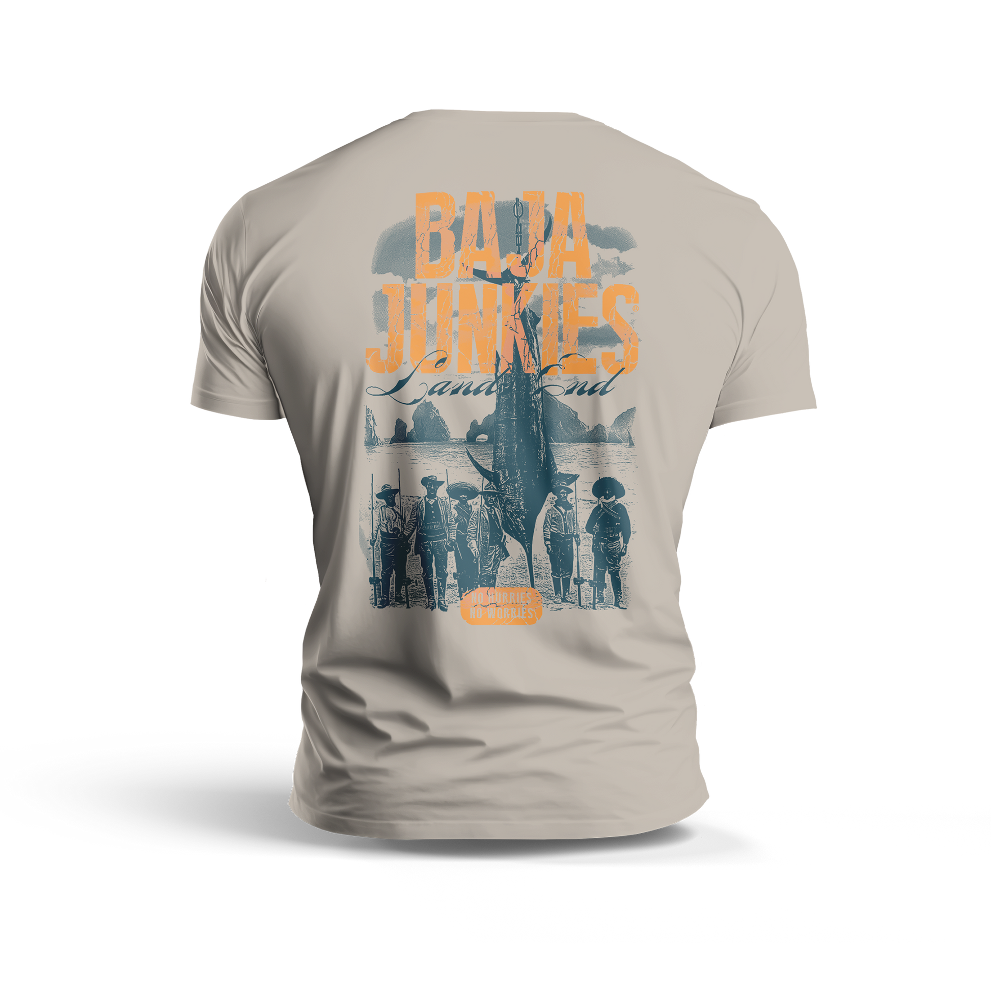 From the Baja Junkies Lands end. The "Fish Revolucion" Tee is a 100% Cotton Sand Color T-shirt with a 4 Color design front left chest, and 4 color design on the back. Screen-printed by our sister company Ntensetees.com