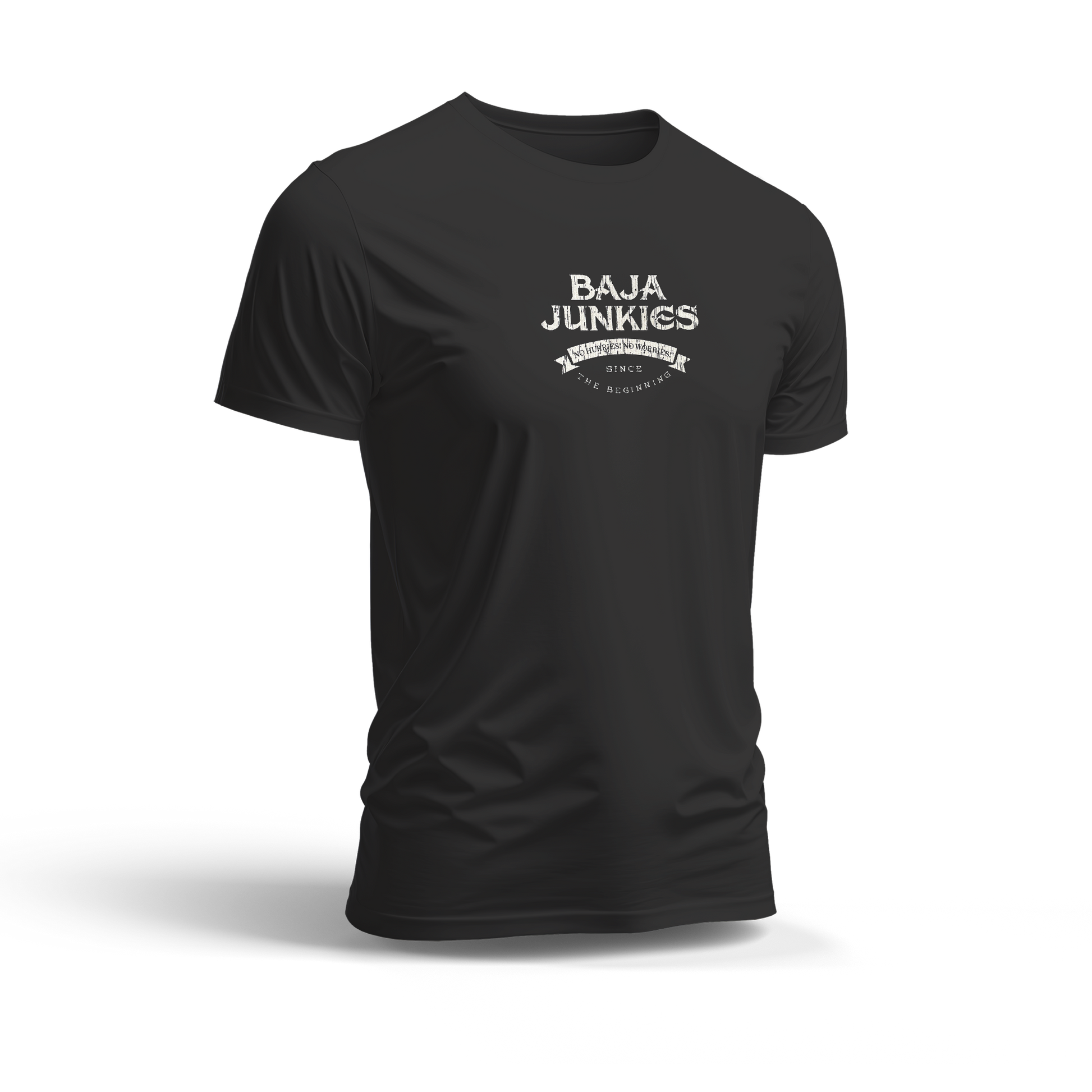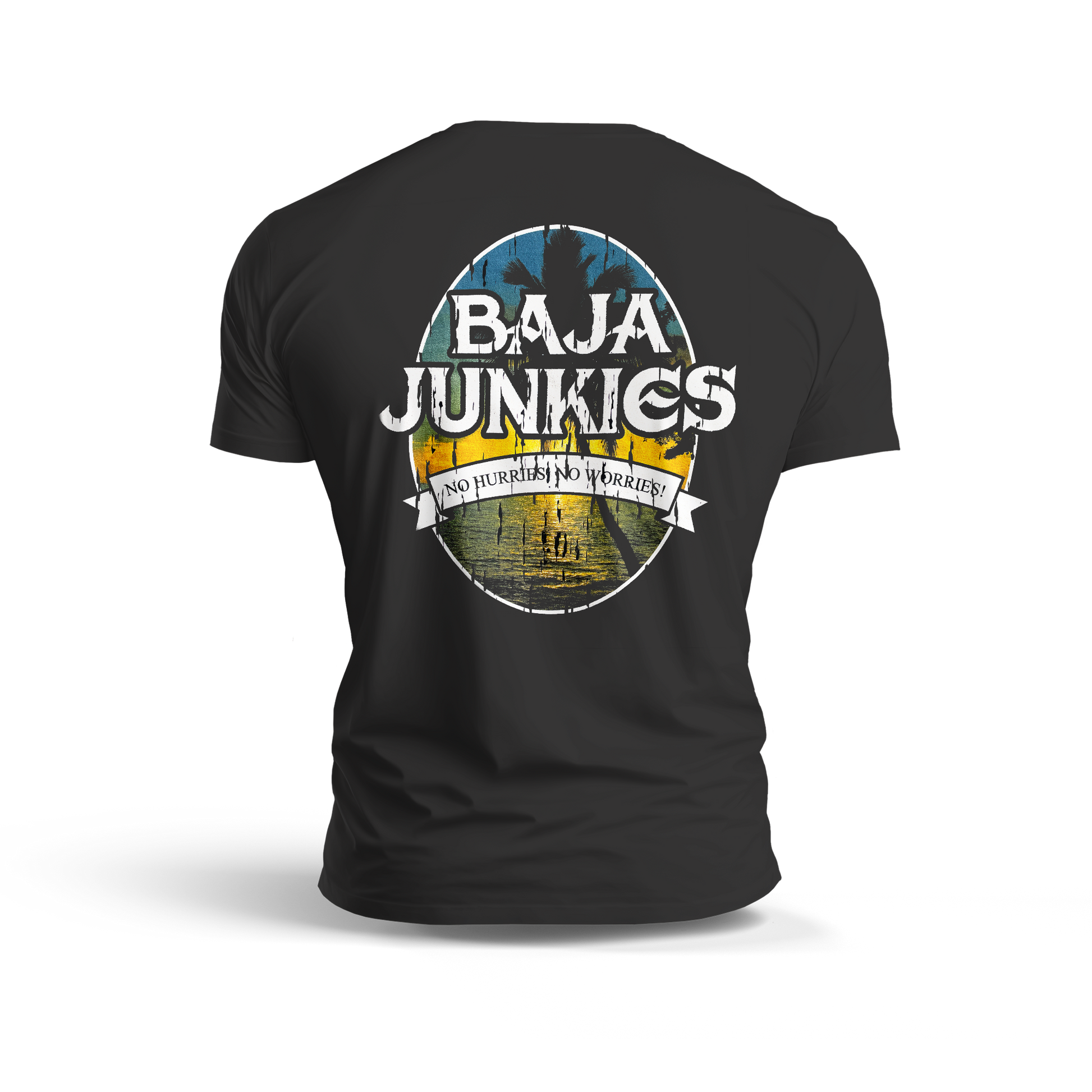 From the Baja Junkies Lifestyle collection. The "Lifestyle" Tee is a 100% Cotton Black Color T-Shirt with a 1 Color design front center, and a 5 color design on the back. Screen-printed by our sister company Ntensetees.com