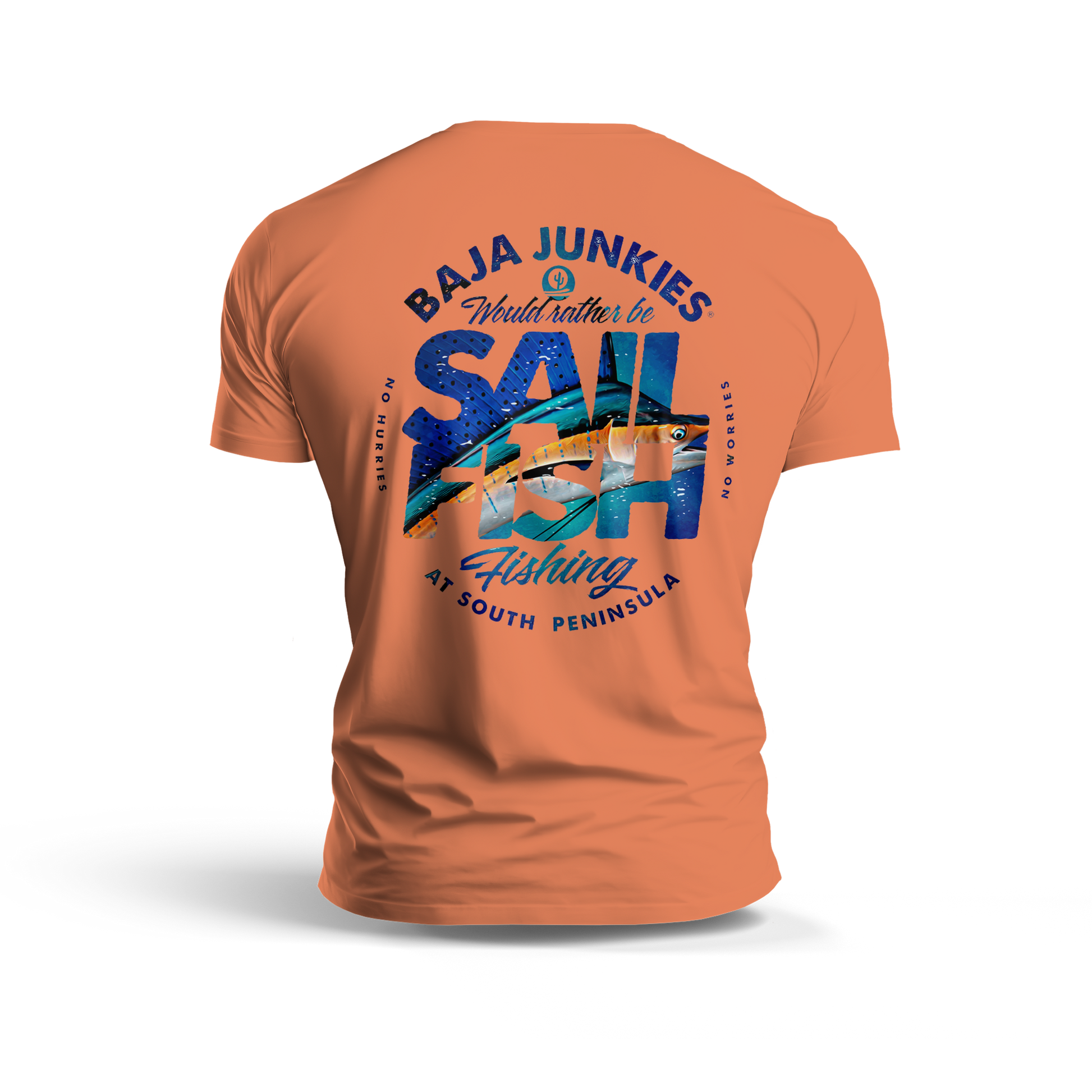 From the Baja Junkies Lands end collection. The "Sail Fish" Tee is a 100% Cotton Tangerine Color T-shirt with a multicolor screen-print on the front LC, and on the back. Screen-printed by our sister company Ntensetees.com